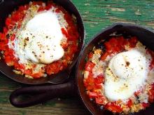 | Tomato-baked eggs with soured cream recipe | delicious. magazine red onion, chili dried/powder, olive oil, parsley, paprika, coriander seed, garlic, tomato, eggs, sherry vinegar, sugar, sour cream Baked eggs are a guaranteed crowd pleasure. This vegetarian recipe uses mainly storecupboard ingredients making it a cheap way to feed the whole family. Heat the oil in a large non-stick pan over a me...