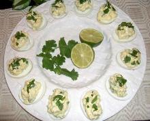 | Mexican-Style Deviled Eggs Recipe - Food.com black olive, chili dried/powder, green chili, cayenne pepper, eggs, mayonnaise This recipe was given to me by a friend several years ago. It has a very unique flavor and is quite addicting. Garnish with chopped ripe olives or cilantro, and serve with your favorite salsa. Serving...