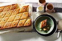 Basbousa | Semolina cake | Egyptian recipes | SBS Food butter, semolina, desiccated coconut, almond, vanilla extract, sugar, self raising flour, lemon juice, rose syrup, milk, yogurt (plain), water Preheat the oven to 190 C. Mix the semolina, coconut, sugar, flour, yoghurt, melted butter and vanilla in a bowl. If the mixture seems too thick, add a little milk, but it should still be fairly stiff...