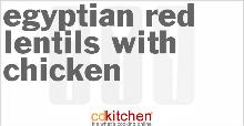 | Egyptian Red Lentils With Chicken Recipe | CDKitchen.com butter, chicken leg, tomato paste, pitta bread, chicken stock, oil, turmeric, pepper, paprika, fennel seeds, coriander, cayenne pepper, cinnamon, cumin, dried ginger, lentil, lemon, carrot, onion, garlic, celery, salt A recipe for Egyptian Red Lentils With Chicken made with red lentils, vegetable oil, onion, carrot, celery, garlic, cayenne pepper, paprika Rinse the red lentils under running water and pick out any n...