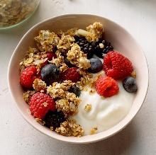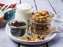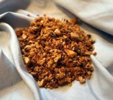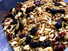 | Homemade Granola Recipe | CDKitchen.com dried cranberry, oil, oats, almond, vanilla, cinnamon, raisin, salt, honey, brown sugar, chocolate A delicious homemade granola recipe that can be eaten as a snack, mixed with yogurt for breakfast, used as an ice cream topping, or in any recipe calling for granola. Preheat the oven to 300 degrees F...