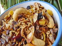 | Homemade Granola Recipe | MyRecipes dried cranberry, cooking spray, oats, pecan, almond, apricot, salt, honey, maple syrup, brown sugar, almond essence, pineapple juice Make extra batches of this maple-and-honey-sweetened nutty granola so you'll have some on hand for quick breakfasts and snacks. Instructions Checklist Step 1 Preheat oven to 300 . Advertisement...