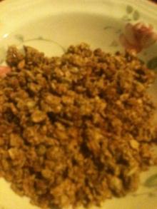| Granola (homemade) Recipe | SparkRecipes oatmeal, nuts, vanilla, raisin, honey, brown sugar Microwave all ingredients (except for raisins) for 5 minutes (stirring twice throughout cooking). Add raisins. Store in airtight container. Number of Servings: 6 Recipe submitted by SparkPeople user ...