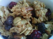 | Homemade granola dried cranberry, oil, oats, cashew, almond, coconut, fig, cherry, apricot, honey 1) Preheat the oven to 180C/Gas 4. Toss the oats, coconut and almonds together in a large bowl. Whisk together the oil and honey in another small bowl. 2) Pour the liquids over the oat mixture and st...