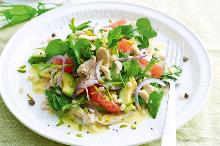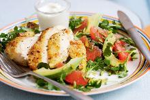 | Chicken with avocado and pink grapefruit salad - Recipes - delicious.com.au chicken breast, olive oil, pistachio, watercress, avocado, grapefruit, sugar, lemon juice, yogurt (plain) With the weather getting warmer, this cafe-style meal gives Thursday night's dinner a citrusy twist. 1. Preheat oven to 180 C. 2. Remove grapefruit peel and pith. Holding the fruit in your hand...