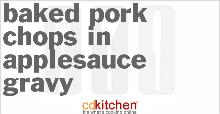 | Baked Pork Chops In Applesauce Gravy Recipe | CDKitchen.com pork chop, apple sauce, pepper, onion, salt, tomato ketchup/catsup, water, flour A recipe for Baked Pork Chops In Applesauce Gravy made with pork chops, flour, salt, pepper, ketchup, water, onion Brown pork chops on both sides in skillet; season with salt and pepper. Place pork ch...