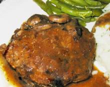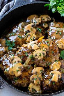 | Salisbury Steak With Mushroom Gravy Recipe butter, beef stock, ground beef, oil, pepper, mushrooms, onion, eggs, salt, bread crumbs, flour My husband loves anything with gravy on top. I like this recipe which allows me to use lean ground beef, ground pork or even ground turkey. I serve this with either oven baked potatoes or mash. Life i...