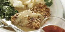 | Chicken-Fried Steak & Gravy Recipe | EatingWell egg whites, beef steak, beef stock, cornstarch, canola oil, pepper, paprika, wholewheat flour, salt, water, half and half, flour Can you really make a chicken-fried steak that isn't loaded with saturated fat and salt? Absolutely. We skip the deep frying, but with rich country gravy as consolation, you won't miss it. Our...