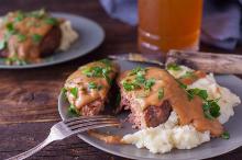 | Salisbury Steak with Mushroom Gravy - Cafe Delites butter, beef stock, ground beef, cornstarch, olive oil, thyme, pepper, parsley, oregano, basil, mushrooms, onion, eggs, worcestershire sauce, salt, tomato ketchup/catsup, seasoning, bread crumbs This classic salisbury steak is smothered in a mushroom and onion gravy and is ready in just 30 minutes! One of those comfort food favorites that never goes out of style. It's quick to make, inexp...