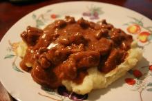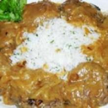 | Salisbury Steak With Onion Gravy Recipe ground beef, onion soup, pepper, eggs, mustard, worcestershire sauce, salt, tomato ketchup/catsup, noodles, bread crumbs, water, flour Great comfort food here. This one has been around for awhile and one my mother made for us as kids and my siblings and I still make it for our families. It never gets old. Yummy In a large bowl beat t...