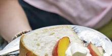| Great-Grandmother Pearl's Angel Food Cake with Peaches Recipe egg whites, cake flour, vanilla extract, peach, salt, cream of tartar, sugar, almond essence, whipped cream Preheat the oven to 325 . In a standing electric mixer, beat the egg whites at medium speed until foamy. Add the cream of tartar and salt and beat until stiff peaks form. Beat in 2 1/2 cups of the sug...