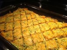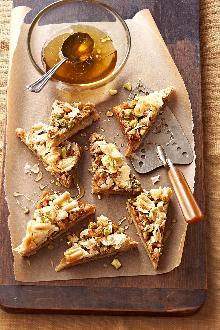 Greek Baklava Bars butter, lemon peel, cooking spray, walnut, pistachio, vanilla, cloves, cinnamon, allspice, eggs, salt, dough, honey, brown sugar, sugar, lemon juice, flour Delight your taste buds with a delicious Greek dessert! Topped with a nut spread and drizzled with honey, there's no way you can stop at just one piece of pistachio baklava! Preheat oven to 350 de...