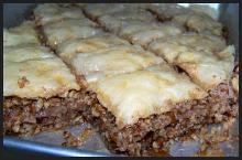 | Greek baklava Walnut Honey-Glazed Cake Recipe - Greek.Food.com butter, orange peel, walnut, vanilla, cinnamon, eggs, salt, baking powder, honey, sugar, lemon juice, milk, water, flour I have made this cake many times in the past and always receive raves reviews all around, it's a buttery cake loaded with walnuts then soaked in honey syrup, trust me you will love this cake! Serv...