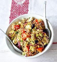 | Greek salad with bulgur wheat recipe | delicious. magazine black olive, bulgur wheat, red onion, feta cheese, olive oil, parsley, oregano, mint, lemon, tomato, cucumber, balsamic vinegar A twist on the traditional Greek salad recipe – with added bulgur wheat for extra sustenance. For a more classic version, try this simple Greek salad. Put the bulgur wheat in a pan and pour 400m...