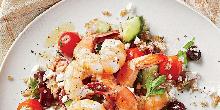 | Greek Bulgur Salad with Shrimp Recipe | MyRecipes kalamata olive, bulgur wheat, red onion, feta cheese, olive oil, pepper, parsley, oregano, tomato, cucumber, shrimp, salt, lemon juice This recipe combines bulgur and grilled shrimp with the classic Greek salad ingredients. Instructions Checklist Step 1 Combine bulgur and 1 1/2 cups water in a small saucepan; bring to a boil. Cove...