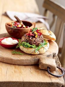 | Greek beef burger with beetroot relish recipe | delicious. magazine feta cheese, poppy seed, parsley, garden rocket, beef, worcestershire sauce, mayonnaise Mix all the relish ingredients together in a small bowl. Season with salt and pepper and set aside. Put the beef mince in a bowl, season and stir in the Worcestershire sauce and parsley. With wet han...