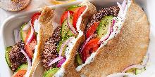 | Greek-Inspired Burgers with Herb-Feta Sauce Recipe | EatingWell ground lamb, red onion, feta cheese, pitta bread, lemon peel, ground beef, pepper, oregano, tomato, cucumber, salt, lemon juice, yogurt (plain) These healthy burgers get a Mediterranean twist with a yogurt sauce seasoned with oregano, lemon and feta cheese. If you can't find ground lamb, ask the butcher to grind some for you. Instructions...