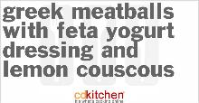 | Greek Meatballs with Feta Yogurt Dressing and Lemon Couscous Recipe | CDKitchen.com butter, kalamata olive, feta cheese, chili dried/powder, chicken stock, ground beef, olive oil, pepper, parsley, oregano, spring onion, garlic, tomato, eggs, salt, cous cous, bread crumbs, lemon juice, milk, yogurt (plain) A recipe for Greek Meatballs with Feta Yogurt Dressing and Lemon Couscous made with bread crumbs, milk, feta cheese, parsley, scallions, salt, dried oregano, egg, ground For Meatballs: Combine crumbs,...