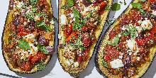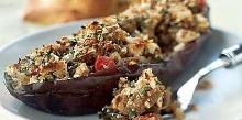 | Greek Stuffed Eggplant Recipe | EatingWell kalamata olive, red onion, feta cheese, tomato paste, red bell pepper, olive oil, parsley, oregano, dill, cumin, garlic, tomato, aubergine/eggplant, red wine vinegar This Greek-inspired stuffed eggplant is filled with veggies and flavors of the Mediterranean. The dish is easy to pull together and the addition of cumin gives it a sweet, earthy note. Instructions Ch...