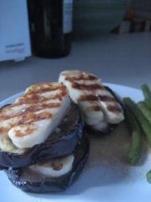 | Halloumi and Eggplant (Aubergine) Stack Recipe - Greek.Food.com sweet chili sauce, halloumi cheese, olive oil, spearmint, coriander leaf, onion, garlic, aubergine/eggplant, balsamic vinegar, salt, brown sugar, flour This is a wonderful vegetarian meal focusing on a marvellous Cypriot cheese - Haloumi. You could also make smaller stacks to serve 4 as an appetizer. Serving Size: 1 (297) g Servings Per Recipe: 2 A...