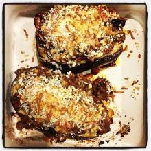 Greek-style Stuffed Eggplant Recipe feta cheese, cooking spray, pepper, parsley, onion, garlic, tomato, aubergine/eggplant, salt, parmesan cheese, bread, white wine, water Well got this recipe from my Greek friend several years ago no changes have been made to this recipe it good like it is Carefully remove pulp from each eggplant, reserving shells. Coarsely chop pulp ...