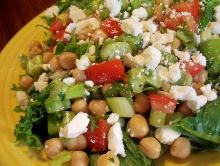| 15 Minute Greek Garbanzo Bean Salad Recipe - Healthy.Food.com feta cheese, olive oil, pepper, parsley, mint, chickpea, spring onion, garlic, celery, tomato, lettuce, salt, lemon juice This high protein, fresh tasting, vegetarian salad is very quick and easy to prepare. In fact it can be made in just 15 minutes from start to finish, and can be kept for a few days in the refrigerator...