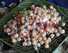 | 5-Minute Greek Garbanzo Bean Salad Recipe - Food.com kalamata olive, red onion, feta cheese, olive oil, rosemary, pepper, parsley, chickpea, garlic, tomato, salt, lemon juice If you don't have time to cook your beans canned garbanzo beans (BPA- free) makes this Mediterranean-style salad an easy addition to your Healthiest Way of Eating. And you will also be enjoying a ...