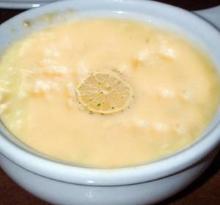 | Avgolemono Soup (Greek Egg-Lemon Soup) Recipe - Food.com butter, egg yolks, chicken stock, cornstarch, pepper, parsley, lemon, salt, rice, lemon juice, milk A classic and flavorful soup, originating in Greece. Serving Size: 1 (278) g Servings Per Recipe: 10 AMT. PER SERVING % DAILY VALUE Calories: 213.1 Calories from Fat 100 g 47 % Total Fat 11.2 g 1...