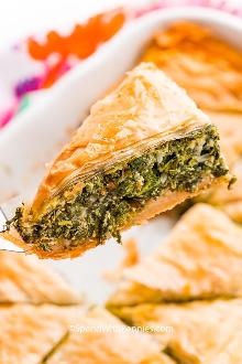 Spanakopita {Greek Spinach Pie} - Spend With Pennies feta cheese, chili dried/powder, olive oil, parsley, onion, garlic, spinach, eggs, salt, dough, parmesan cheese Spanakopita is a Greek Spinach Pie that is made with phyllo dough layered with a homemade spinach and feta filling. It is a great appetizer or side dish! Preheat oven to 325 F and brush the bottom and...