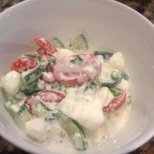 | Creamy Greek-Style Caprese Salad Recipe - Food.com dried garlic, spring onion, tomato, cucumber, salt, mozzarella cheese, yogurt (plain) A healthy take on an already healthy salad with a Greek twist Serving Size: 1 (136) g Servings Per Recipe: 4 AMT. PER SERVING % DAILY VALUE Calories: 199.1 Calories from Fat 119 g 60 % Total Fat ...