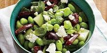 | Greek-Style Orzo and Double-Bean Salad orzo pasta, kalamata olive, red onion, feta cheese, olive oil, pepper, parsley, oregano, edamame, soybean, green beans, tomato, cucumber, mustard, red wine vinegar, salt Get a taste of the Mediterranean in this tasty bean and pasta salad. Feel free to swap couscous or quinoa for orzo. In a large saucepan cook pasta according to package directions, adding green beans a...