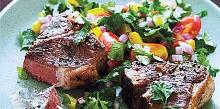| Lamb Loin Chops with Greek Salad and Yogurt-Lemon Sauce Recipe lamb loin, kalamata olive, red onion, feta cheese, olive oil, pepper, oregano, lemon, tomato, cucumber, salt, yogurt (plain) To stretch this salad into a full meal, I immediately thought of lamb. Though I didn't have time to roast a whole leg of lamb (shame), I did have the eight minutes necessary to cook up these cute ...