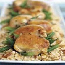 | Zesty Green-bean Almond Chicken Recipe Recipe chicken thigh, italian dressing, chicken stock, almond, green beans, rice A Great Meal all in One Skillet! Now that's easy clean up! TOSS chicken with dressing in resealable plastic bag. Add chicken with dressing to large nonstick skillet on medium-high heat; cook 4 min...
