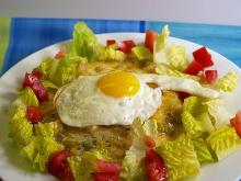 | Old Style Green Chile Enchiladas Recipe | CDKitchen.com chicken, chicken stock, oil, green chili, cumin, onion, garlic, tomato, lettuce, eggs, salt, cheddar cheese, tortilla, sour cream, water, flour Classic chicken enchiladas made with cooked chicken, green chiles, onion, sour cream, tortillas, and cheese. They are baked, then served topped with a fried egg. Mix flour with water to make a smooth ...
