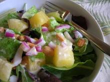 | Desert Island Green Salad Recipe - Food.com dressing, red onion, sesame seed oil, peanut, pineapple, lettuce, mustard, rice vinegar, mayonnaise, sugar, water Serving Size: 1 (161) g Servings Per Recipe: 2 AMT. PER SERVING % DAILY VALUE Calories: 383.1 Calories from Fat 222 g 58 % Total Fat 24.7 g 38 % Saturated Fat 3.5 g 17 % Cholesterol 7.6 mg 2 % ...