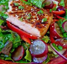 | Seared Salmon With Grapes on a Bed of Greens Recipe - Food.com dressing, salad, vegetables, sesame seed oil, olive oil, sesame seed, pepper, cayenne pepper, dried onion, dried ginger, dried garlic, grape, spring onion, salmon, fish, mustard, balsamic vinegar, soy sauce, salt, brown sugar Healthy fresh and low carb. You will love this! Buy the freshest salmon and use all the marinade I suggest and you will get a nice explosion of flavor in your mouth! Do enjoy and add whatever veggie y...