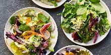 | Herb-Crusted Salmon on Greens Recipe | Bon Appetit vegetables, oil, ginger root, dill, basil, salmon, mustard, lime juice Herb-Crusted Salmon on Greens Recipe Step 1 Whisk lime juice, ginger, and mustard in small bowl. Slowly whisk in 4 tablespoons oil. Season dressing with salt and pepper. Step 2 Brush salmon on both...