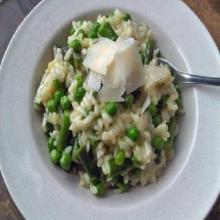 | Asparagus and Green Pea Risotto butter, risotto rice, vegetable stock, chicken stock, oil, pepper, peas, lemon, shallot, garlic, asparagus, salt, stock or broth, parmesan cheese, white wine 1. Melt butter and oil together in a heavy saucepan over a low heat, at the same time, bring the stock to a simmer in another small saucepan. 2. Fry the shallots and garlic until soft, then add the ri...