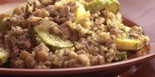 | Lentil & Bulgur Pilaf with Green & Yellow Squash Recipe | EatingWell bulgur wheat, lemon peel, vegetable stock, chicken stock, olive oil, pepper, parsley, dill, coriander leaf, bay leaf, allspice, lentil, yellow squash, onion, garlic, zucchini/courgette, salt, lemon juice Based on a traditional Lebanese Lenten dish, this recipe makes a terrific meatless meal. Serve with warm whole-wheat flatbread or pita and a dollop of tangy plain yogurt. Instructions Checklist Step ...