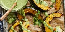 | Roasted Squash with Green Tahini Recipe | EatingWell acorn squash, lemon peel, olive oil, parsley, coriander leaf, cumin, garlic, tahini, salt, lemon juice, water This squash recipe will leave you with some extra green tahini, which you can use as a salad dressing or a dip for crudites. Serve with a roast chicken and mixed green salad for a complete meal. Instr...