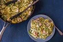 | Green & Yellow Squash 'linguini' W/ Shrimp Scampi Recipe - Food.com chili dried/powder, romano cheese, olive oil, pepper, parsley, basil, lemon, yellow squash, garlic, zucchini/courgette, shrimp, salt, white wine Super light and deliciously satisfying, this creation totally hit the spot on a night I was craving pasta! The best part is? It's so light, feel free to go back for seconds, maybe even thirds! And...