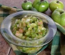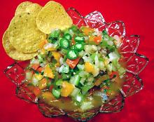 | Green Tomato Salsa Recipe - RecipeTips.com green tomato, sweet onion, olive oil, pepper, jalapeno, spring onion, red wine vinegar, salt, lime juice This flavorful salsa recipe is easy to prepare and can be served over scrambled eggs, omelets, burritos, rice, or fish. Try it with chips or crackers as an appetizer course for Cinco de Mayo Day. PREP...