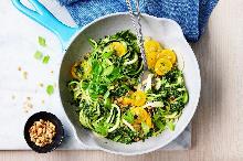 | Colin Fassnidge's zucchini pasta with garden green sauce - Recipes - delicious.com.au olive oil, oil, pine nut, mint, basil, lemon, garlic, zucchini/courgette, tomato, spinach, garden rocket, kale, parmesan cheese “A great way to get the kids to eat vegies,” says chef and TV personality, Colin Fassnidge. 1. Use vegetable spiraliser to make the zucchini pasta (spaghetti style). Set aside. 2. For g...