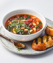| Beans and Greens Soupe au Pistou cannellini bean, vegetable stock, olive oil, pepper, basil, garlic, tomato, swiss chard, salt, parmesan cheese, bread, water Soupe au pistou is a Provencal take on minestrone featuring a nut-free pesto. Remove stems from chard. Chop stems and greens separately. In a 4-quart pot combine broth, 2 cups water, the chard stems,...