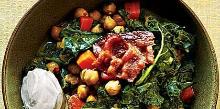 | Garbanzo Beans and Greens Recipe | MyRecipes red pepper, chicken stock, paprika, cumin, chickpea, lemon, carrot, onion, garlic, kale, bacon, salt, yogurt (plain), water Substitute escarole or another hearty green like collards if you don't like kale. Serve with torn baguette bread to soak up all the tasty juices. Instructions Checklist Step 1 Cook bacon in a Du...