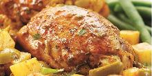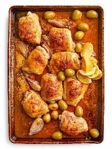 | Sheet-Pan Chicken with Lemons and Green Olives butter, chicken thigh, olive oil, paprika, lemon, olive, shallot, salt Serve this simple one-pan chicken dinner with a side of mashed potatoes, rice, or a chunk of crusty bread to soak up every last drop of the lemon-scented pan juices. Preheat oven to 400 F. Coat a 15 x...