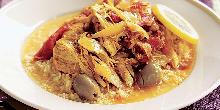 | Chicken Tagine with Green Olives Recipe | EatingWell chicken thigh, chicken stock, olive oil, turmeric, thyme, pepper, paprika, ginger root, coriander leaf, green chili, cinnamon, cumin, olive, potato, onion, garlic, salt, fat, lemon juice Chicken, lemon and green olives are a classic Moroccan flavor combination. Serve over Herbed Couscous with Tomatoes or Brown Rice & Greens. Instructions Checklist Step 1 Preheat oven to 375 degr...