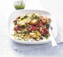 | Quinoa salad with grilled halloumi recipe | BBC Good Food red onion, halloumi cheese, quinoa, vegetable stock, olive oil, pepper, parsley, lemon, sugar This delicious quinoa salad with halloumi is veggie, gluten-free and packed with protein and iron. An easy recipe for a light lunch or dinner, from BBC Good Food. STEP 1 Heat 1 tbsp of the oil in a m...