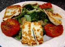 | Spiced Couscous With Grilled Halloumi and Steamed Veggies Recipe - Food.com chili dried/powder, halloumi cheese, vegetable stock, chicken stock, olive oil, pepper, coriander seed, cinnamon, cumin, lemon, green beans, tomato, broccoli, salt, cous cous This couscous is wonderfully aromatic and the whole dish quick to make -- not to mention healthy. I adapted it from one in BBC's Good Food magazine. The chile powder I refer to is simply ground wh...