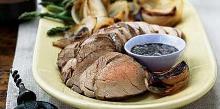 | Pan-Grilled Pork Tenderloin & Pomegranate Molasses Recipe | MyRecipes butter, pork loin, pomegranate molasses, beef stock, cooking spray, five-spice powder, pepper, shallot, pork, salt, honey, red wine One of the flavors often found in pinot noir is pomegranate, which inspired me to create this easy dish. The sauce is based on pomegranate molasses, a thick, savory syrup used in Middle Eastern cookin...